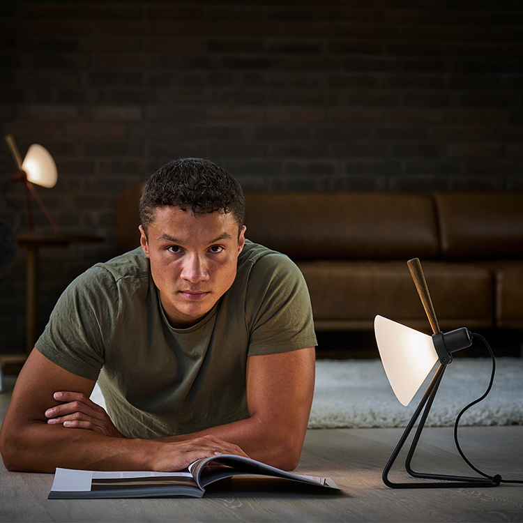 Spot utmärker sig genom sina enkla och slitstarka material som lämnar allt synligt. Lampans justerbara huvud med handtag ger den både en tydlig karaktär och praktisk funktion. Spot kan placeras på bord eller golv, men fungerar även som vägglampa tack vare ett medföljande väggfäste.
