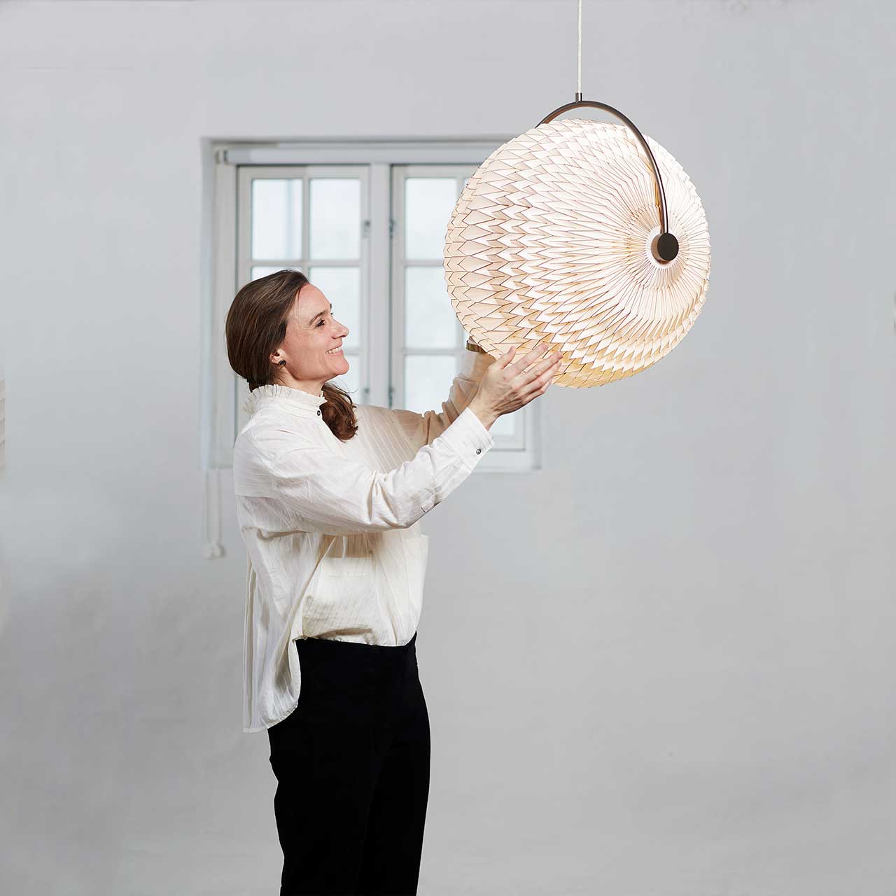 Designer och vinnare av "Danmarks næste klassiker", Rikke Frost, visar upp lampan Caleo. Observera de vackra handritade bruna linjerna på lampan.
