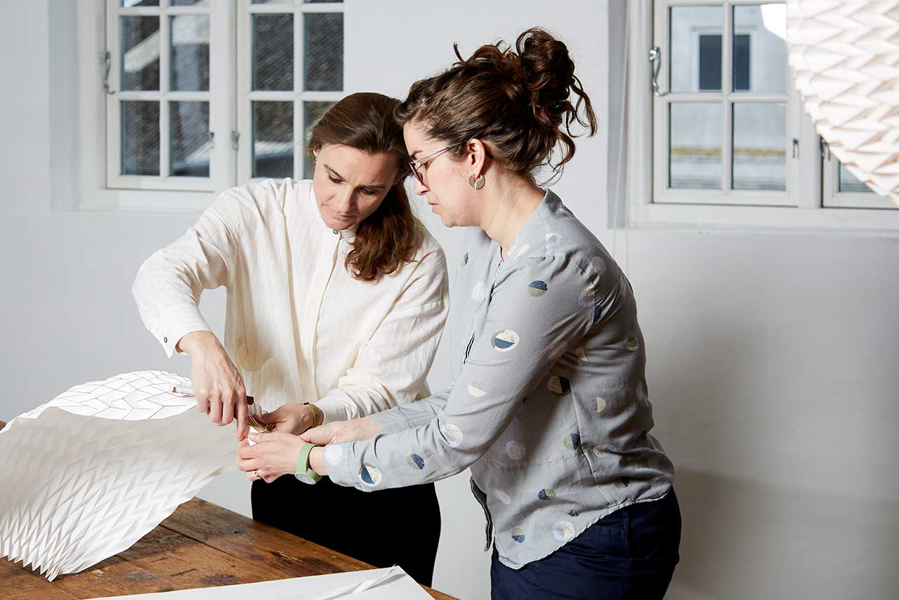 Det klassiska vikthantverket ingår naturligtvis som en väsentlig del av designen, men lampans mönster är vridet 90 grader och plisséerna är sammansatta på ett nytt sätt.