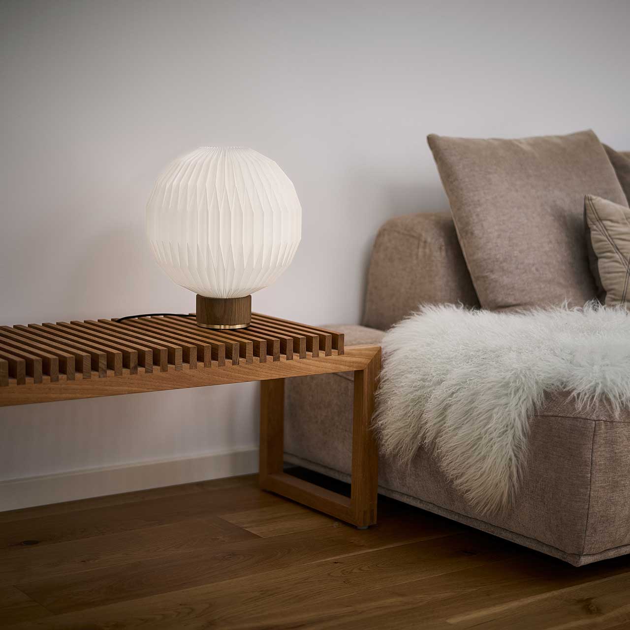 Model 375 är en ny tolkning av den ikoniska Model 107, som ritades av Esben Klint redan 1942 och lanserades i samband med vårt 75-årsjubileum 2018. Den plisserade skärmen är vackert integrerad i en bas av ekträ och med detaljer i mässing. Bordlampan Model 375 finns i storlekarna XS Small, Small och Medium i både ljus och rökt ek.