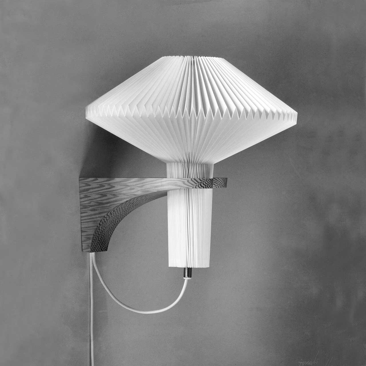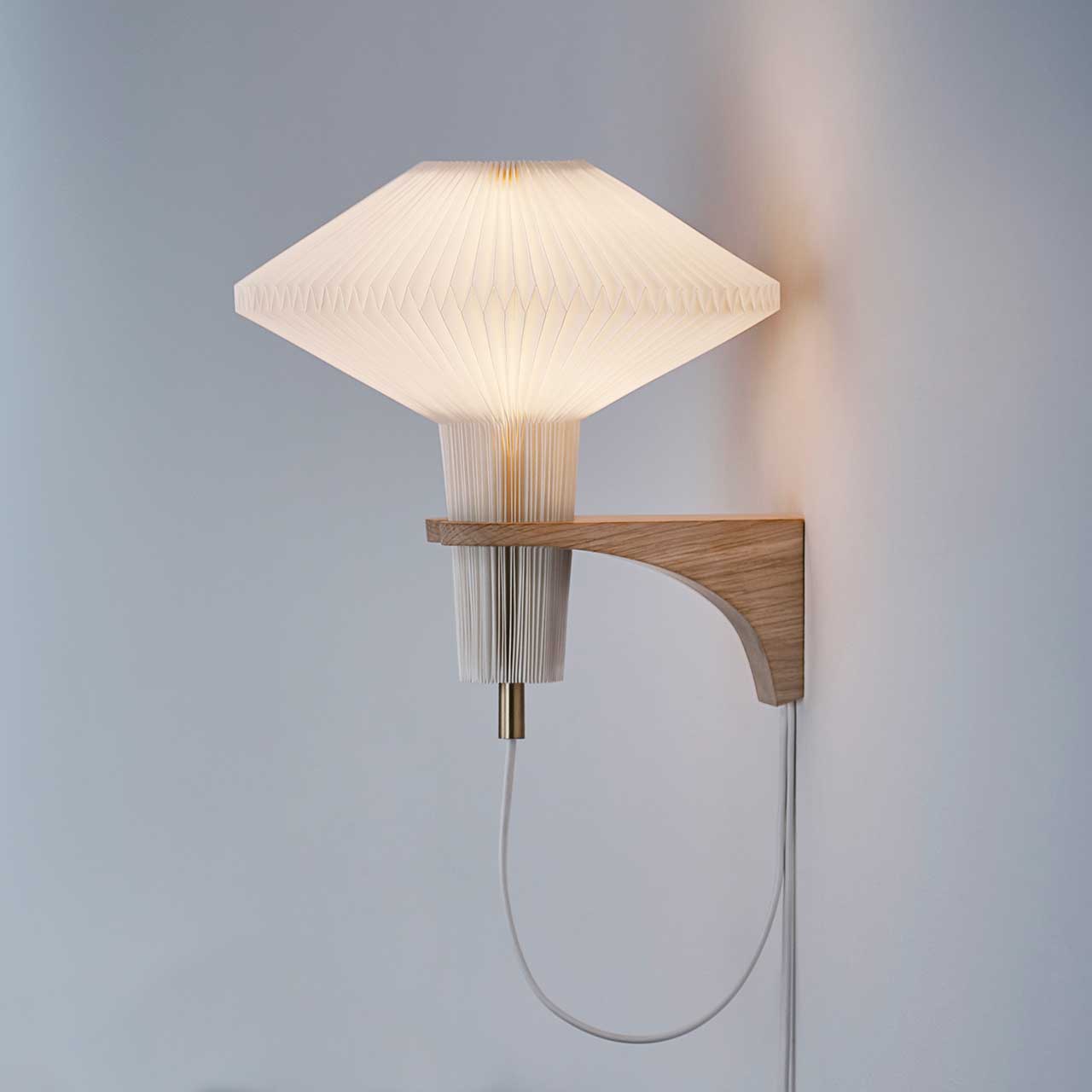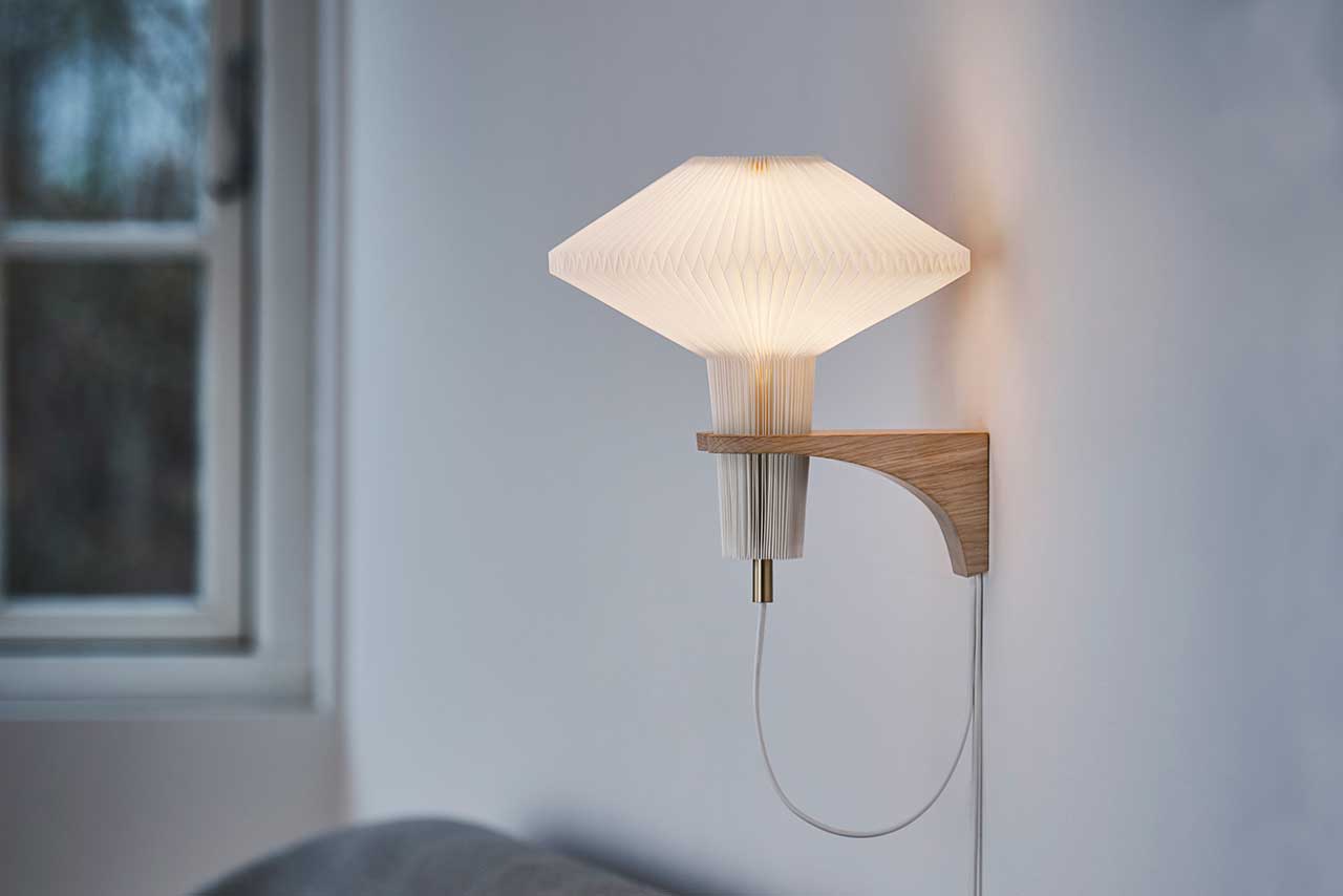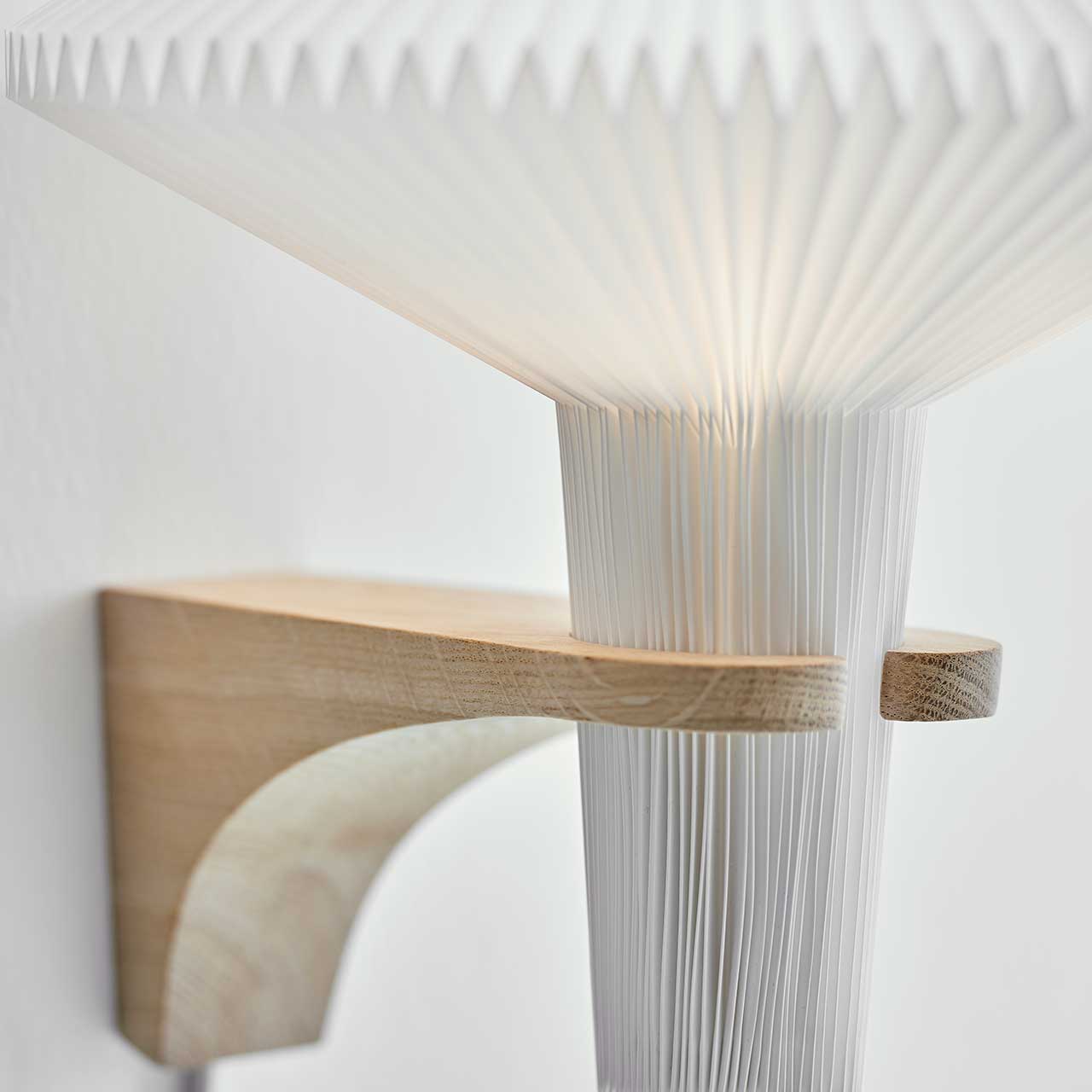 Lampan är en vägglampa med en bas i obehandlad ljus ek. De veckade skärmarna, handgjorda av våra folketjejer i Odense, understryker vår DNA. Den allra första Le Klint-lampan var faktiskt en veckad lampskärm som viks för hand.