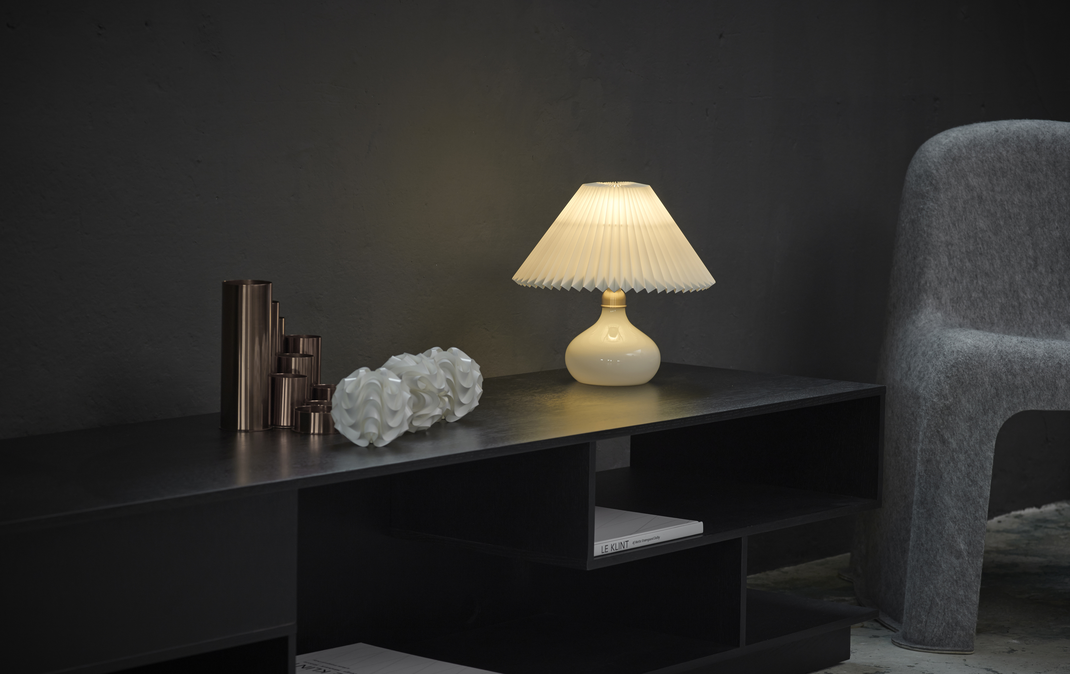 En av de stora nyheterna var LE KLINT 80 - Modell 328, designad av fransmannen Aurélien Barbry, som även tidigare designat lampor åt Le Klint. Modell 328 är baserad på den klassiska Le Klint-lampan med veckad skärm, men den har också ett starkt modernt utseende och är gjord av ek med mässingsdetaljer.