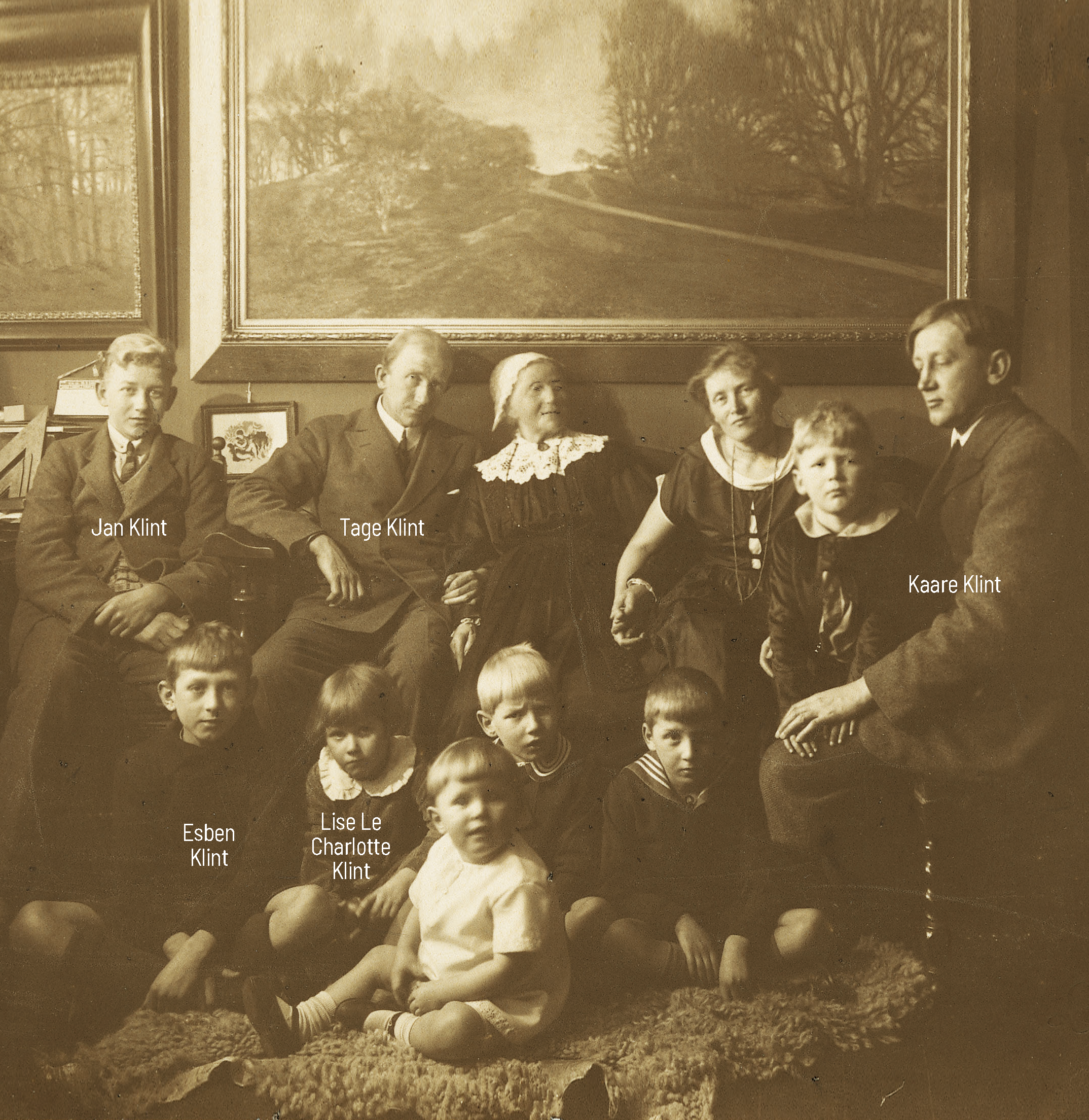 Familjen Klint tillsammans med Mathilde och P.V. Jensen-Klint omkring år 1926. Överst i mitten står mamma Mathilde med sonen Tage till vänster och barnbarnet Jan. Längst till högersitter Kaare. På golvet från vänster står Kaares son, Esben, och bredvid honom står Tages dotter, Le. Det är förmodligen P.V. Jensen-Klint, som är bildens fotograf.