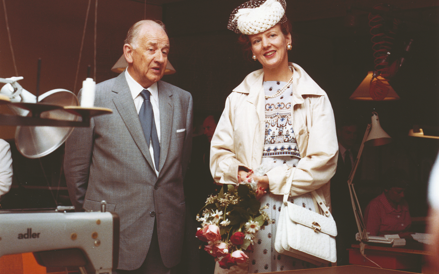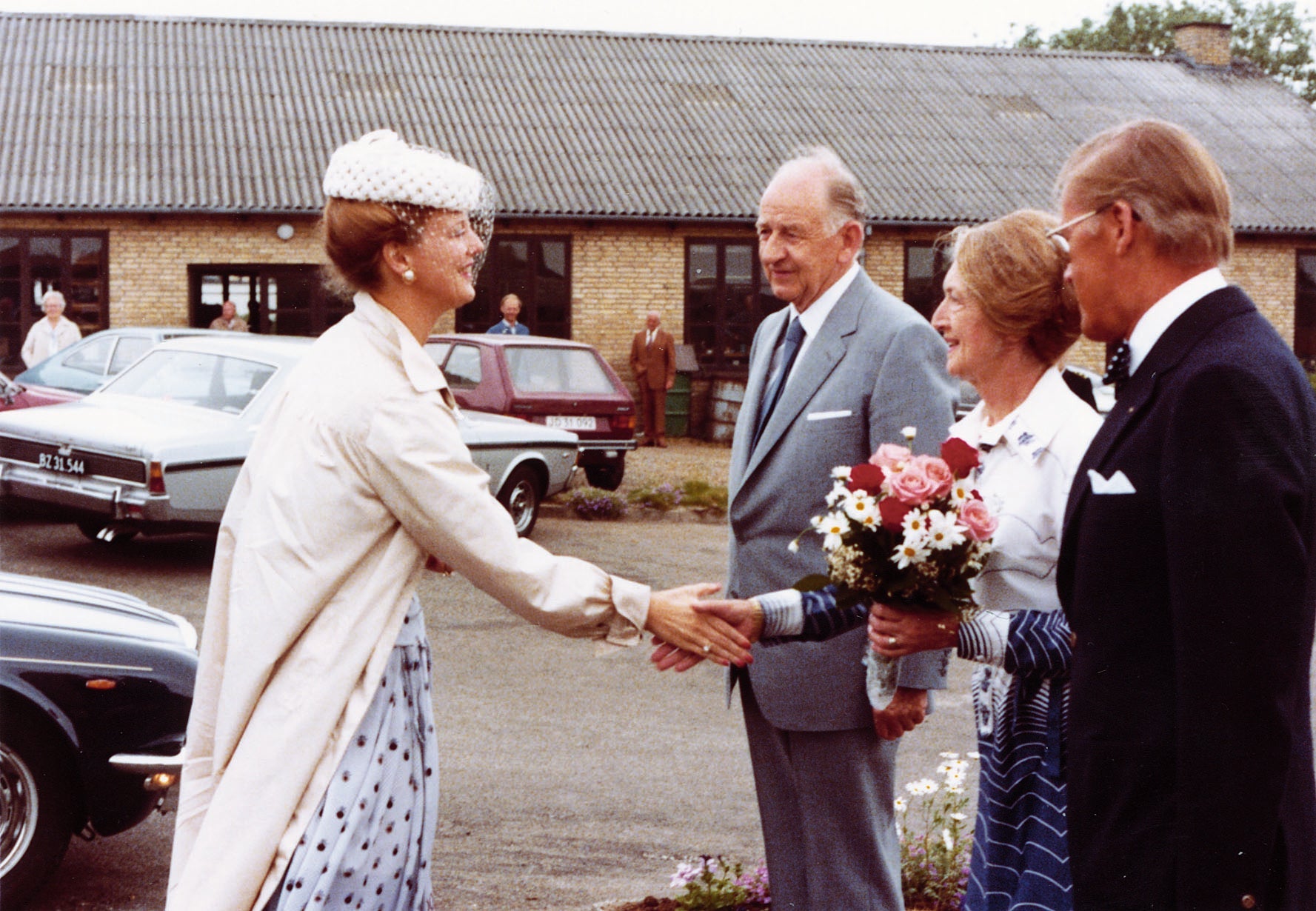 Här tar den dåvarande vd Jan Klint, tillsammans med sin fru, Inger Klint, och ordföranden för fondstyrelsen, advokaten vid hovrätten, Gunnar Neymark, emot Drottning Margrethe.