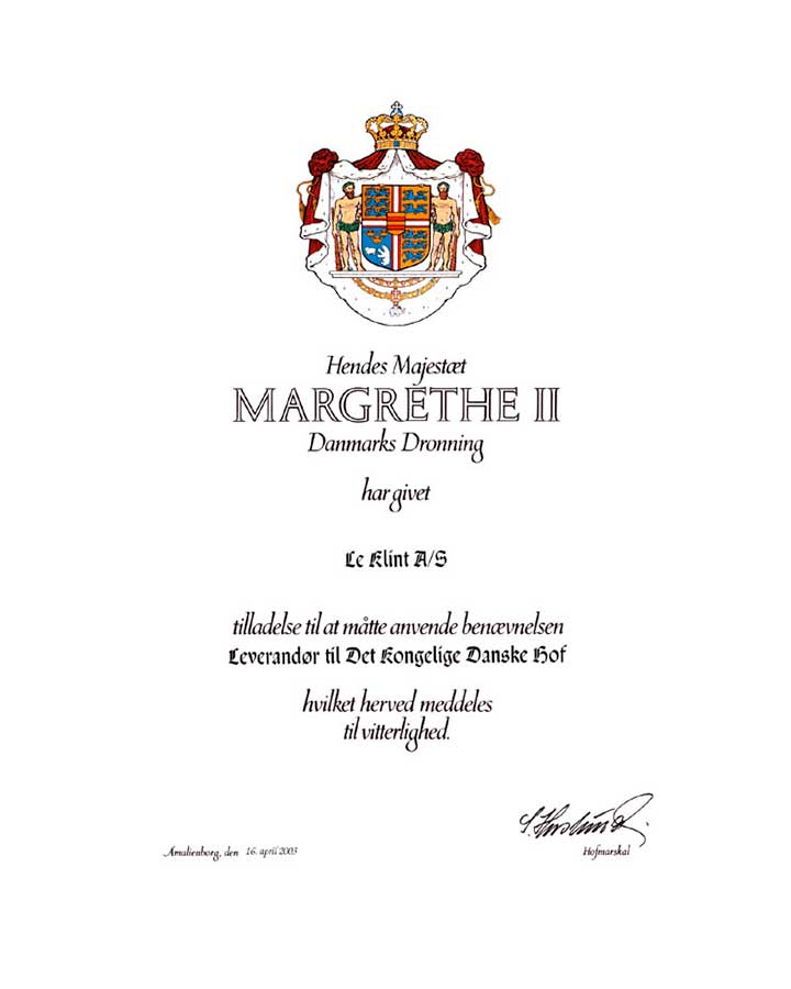 Det var således med stolthet som beskedet om utnämningen till kunglig hovleverantör mottogs den 16 april 2003. Det var dessutom samma år som Le Klint firade sitt 60-årsjubileum.